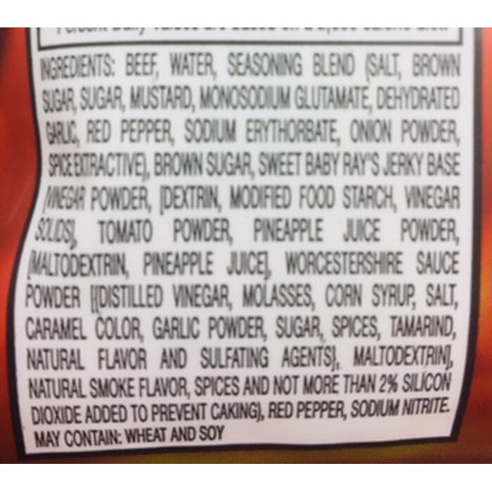 Zutaten: Rindfleisch, Wasser, Gewürzmischung (Salz, Brauner Zucker, Zucker, Senf, Mononatriumglutamat, getrockneter Knoblauch, Pfeffer, Natriumerythorbat, Zwiebelpulver, Gewürzextrakt), Brauner Zucker, Sweet Baby Ray's Sauce (Essigpulver (Dextrin, modifizierte Speisestärke, Essigfeststoffe), Tomatenpulver, Ananassaftpulver (Maltodextrin, Ananassaft), Worcestershire Saucen-Pulver (destillierter Essig, Melasse, Maissirup, Salz, Karamellfarbe, Knoblauchpulver, Zucker, Gewürze, Tamarinde, Aroma, Maltodextrin), Aroma, Gewürze, enthält 2% oder weniger: Silikondioxid), Pfeffer, Natriumnitrit.