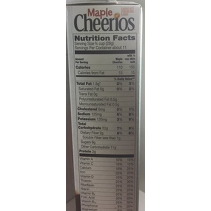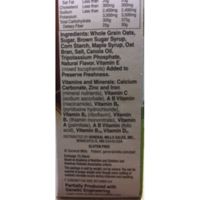 Zutaten: Vollkornhaferflocken, Zucker, Brauner Zuckersirup, Maisstärke, Ahornsirup, Haferkleie, Salz, Rapsöl, Trikaliumphosphat, Aroma, gemischte Tocopherole, Kalziumkarbonat, Zink, Eisen, Natriumascorbat, Niacinamide, Pyridoxinhydrochlorid, Riboflavin, Thiaminmononitrat, Palmitat, Folsäure. Hergestellt mit teilweise genveränderten Zutaten.