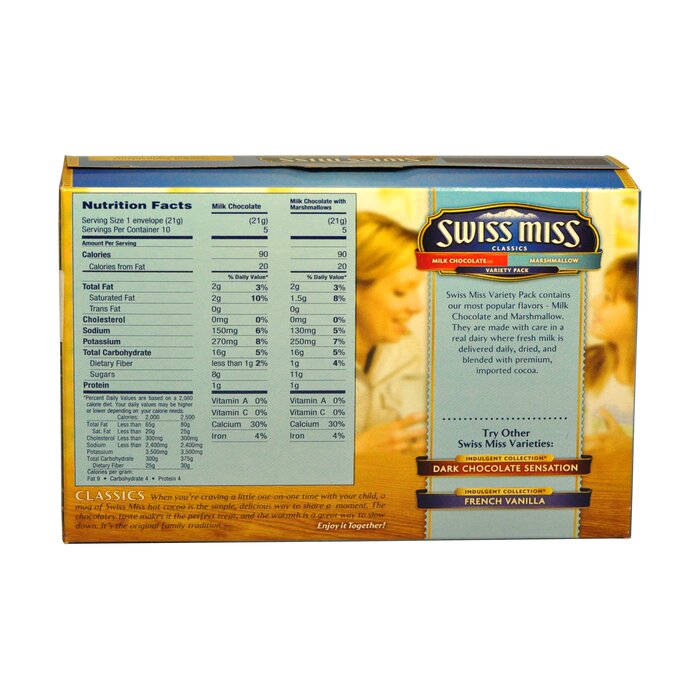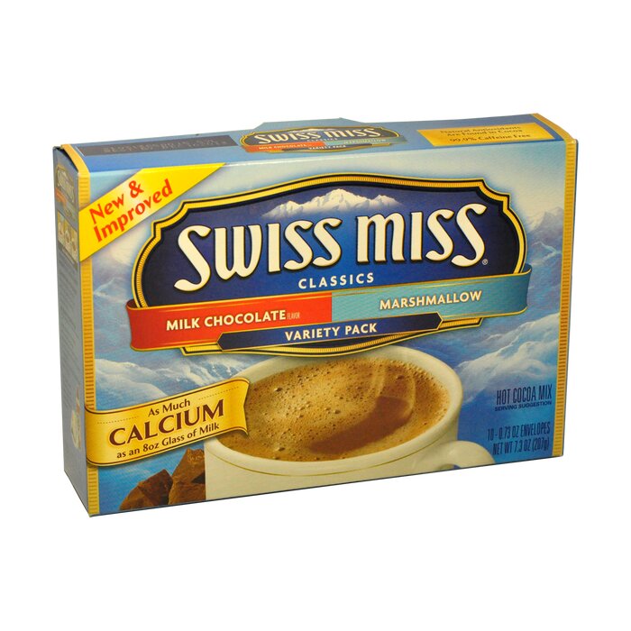 "Swiss Miss Classics Variety Pack" vereint in sich 2 beliebte Swiss Miss-Geschmacksrichtungen - ideal für alle, die sich ungern festlegen oder einfach die Abwechslung lieben. Wie immer ganz einfach und schnell genießen. Heißes Wasser drüber - und fertig! Die Packung enthält je 5 Portionen "Milk Chocolate" und "Milk Chocolate with Marshmallows". Heiße Schokolade für jede Zeit und für jedermann (und natürlich auch für jedefrau ;))! Probieren Sie auch unsere anderen Swiss Miss Produkte hier im Online-Shop.